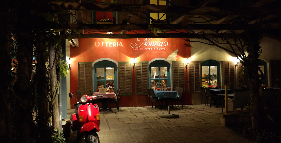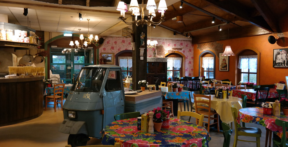 Italian family restaurant, themed as a house of a typical nonna including a raised bed, family pictures, a piagio and an open kitchen with fresh made pasta and a pizza oven. Recycling old furniture and decoration makes this interior concept very recognisable and appreciated by their guests (families) and very cost efficient to build. Concept development started in 2013 and roled all over the parks in Netherlands and Belgium.